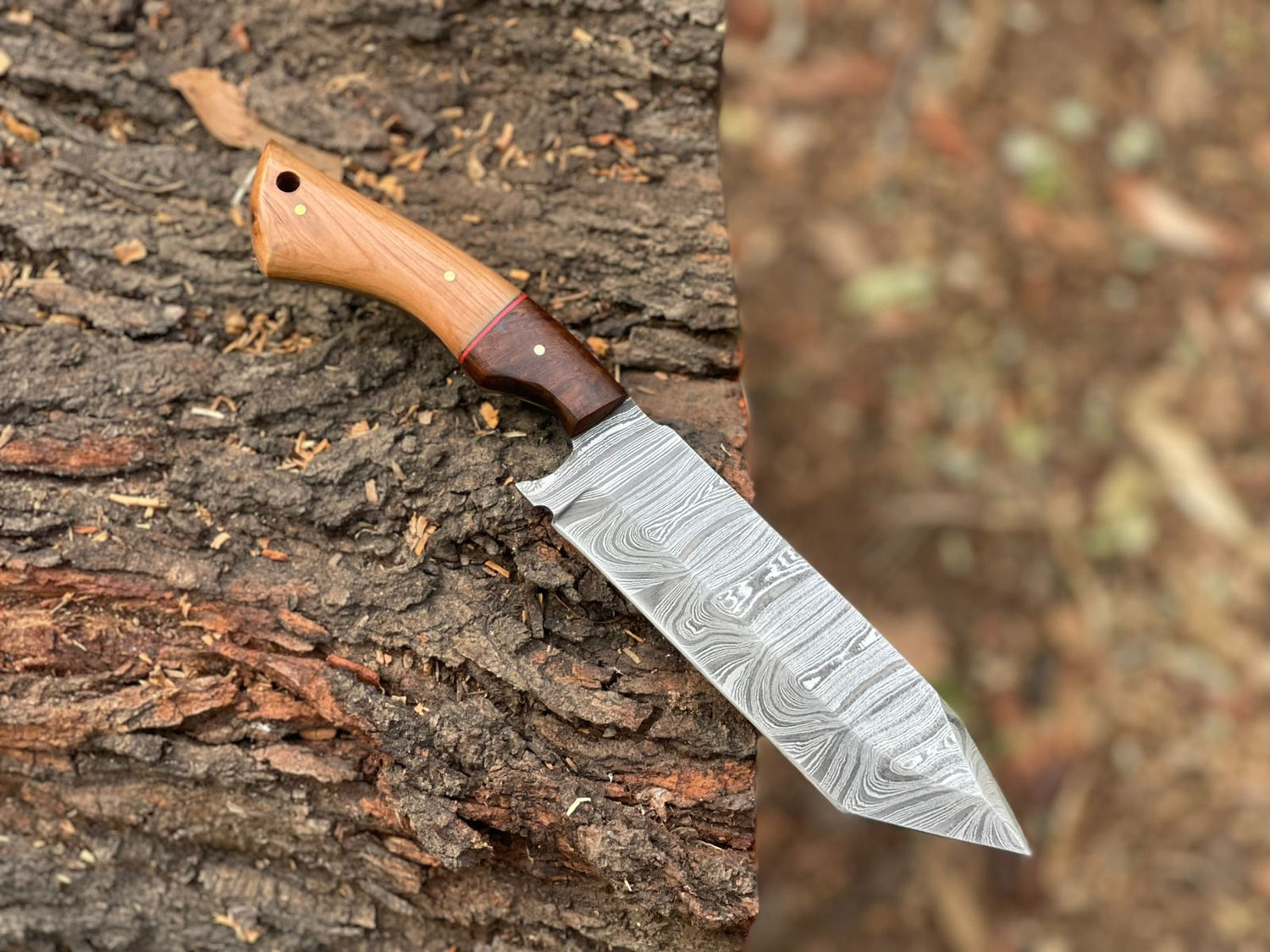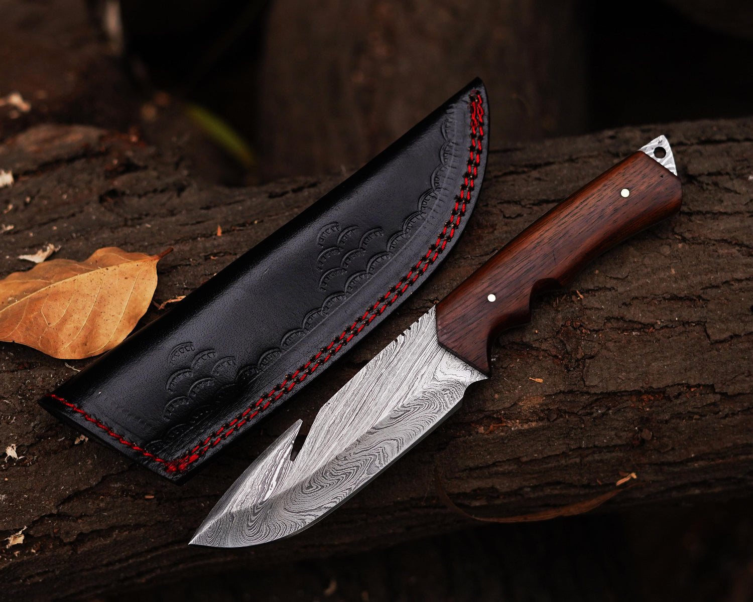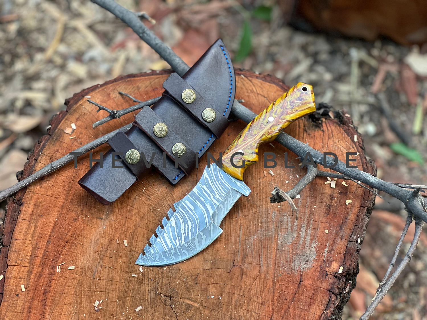 Hand Forged Damascus Steel Blade Hunting Knife With Leather Sheath