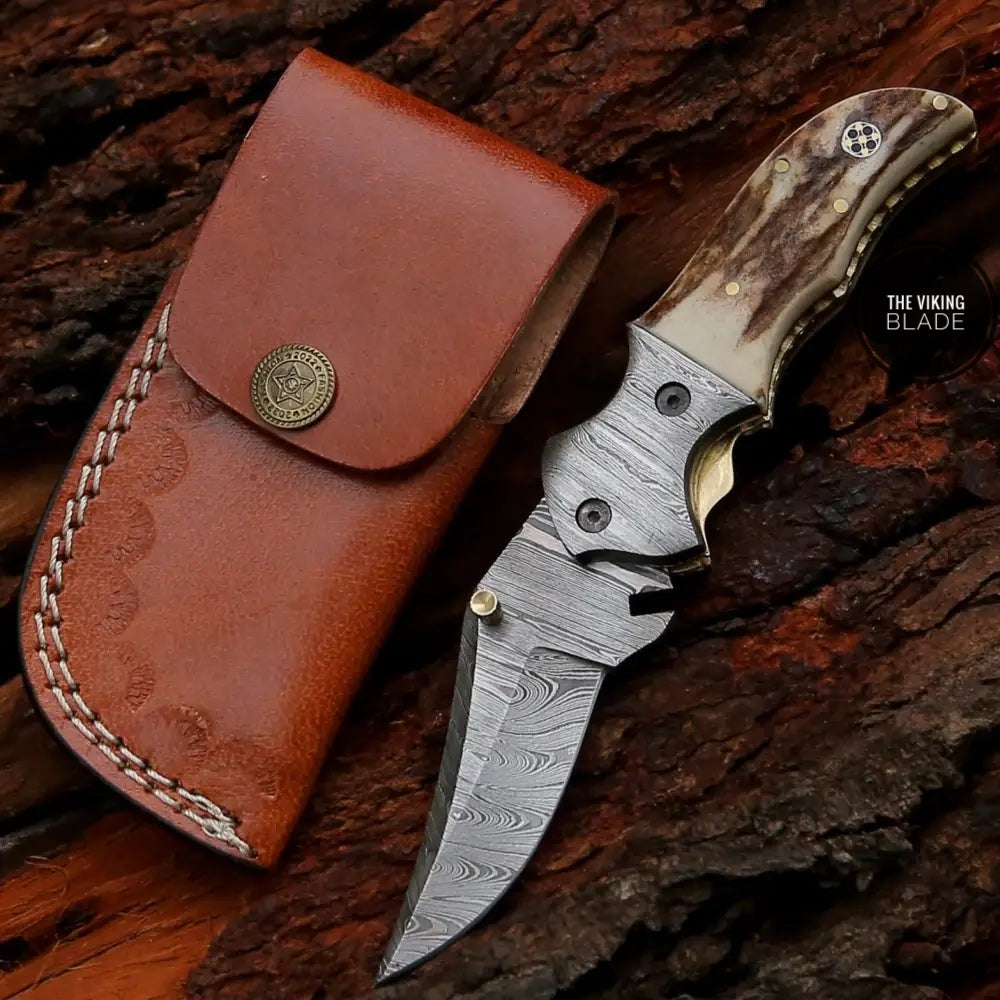 7" Handmade Forged Damascus Pocket Folding Knife - Stag Antler Handle - Damascus Bolster