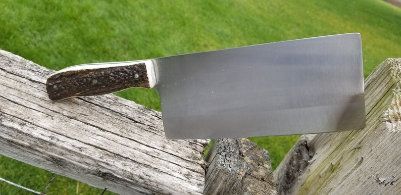 Custom Forged Handmade Full Tang Fixed Blade Meat Cleaver Knife Paired With Elk Stag Antlers