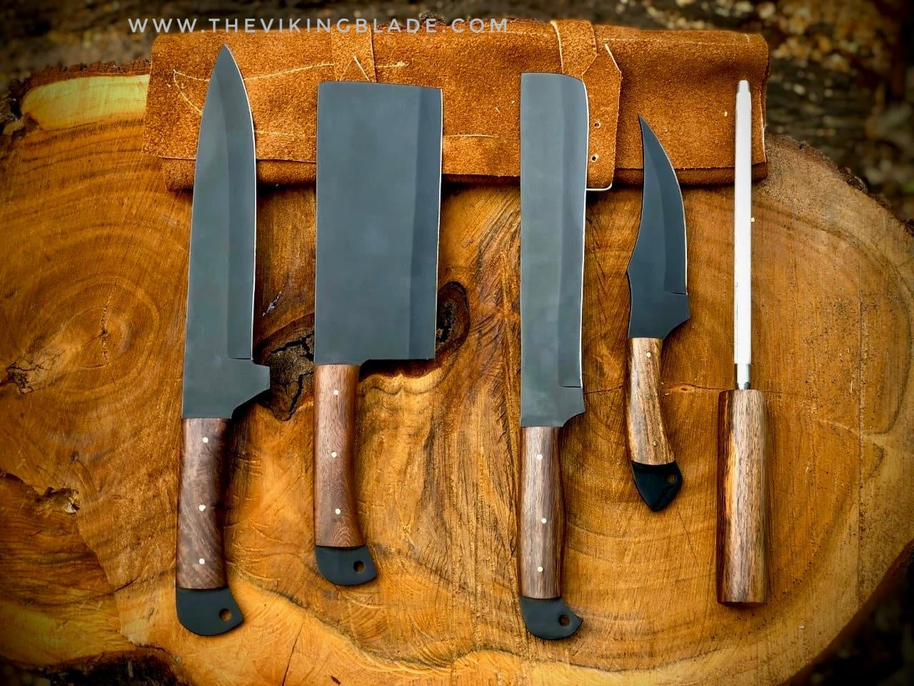 Custom Handmade D2 Steel Kitchen Knives Set With Leather Roll Kit