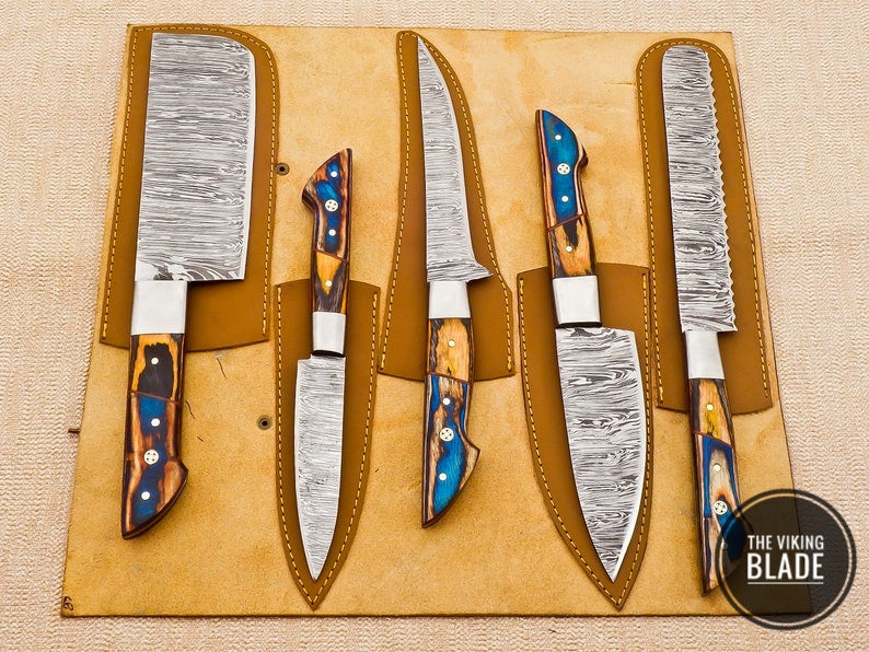 Premium Quality Handmade Damascus Steel Chef Knives Set of 5 Pieces comes with genuine leather sheath.
