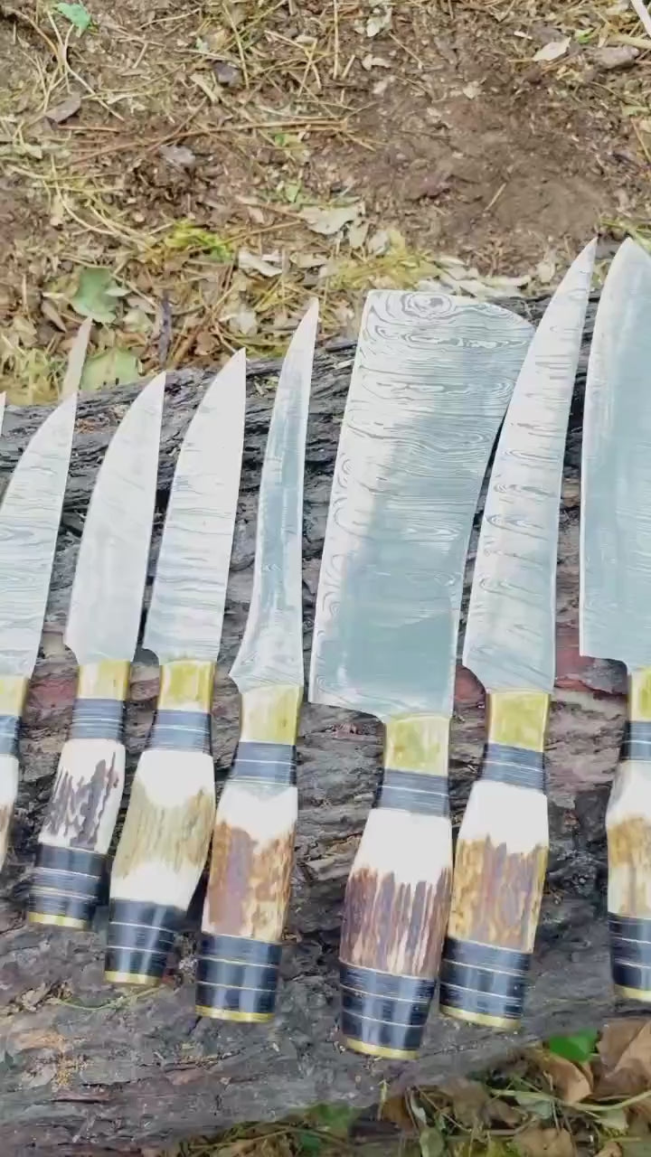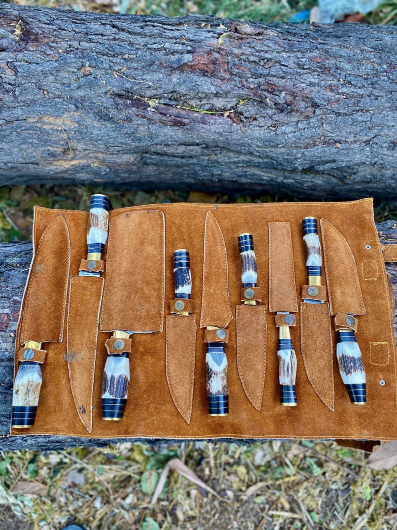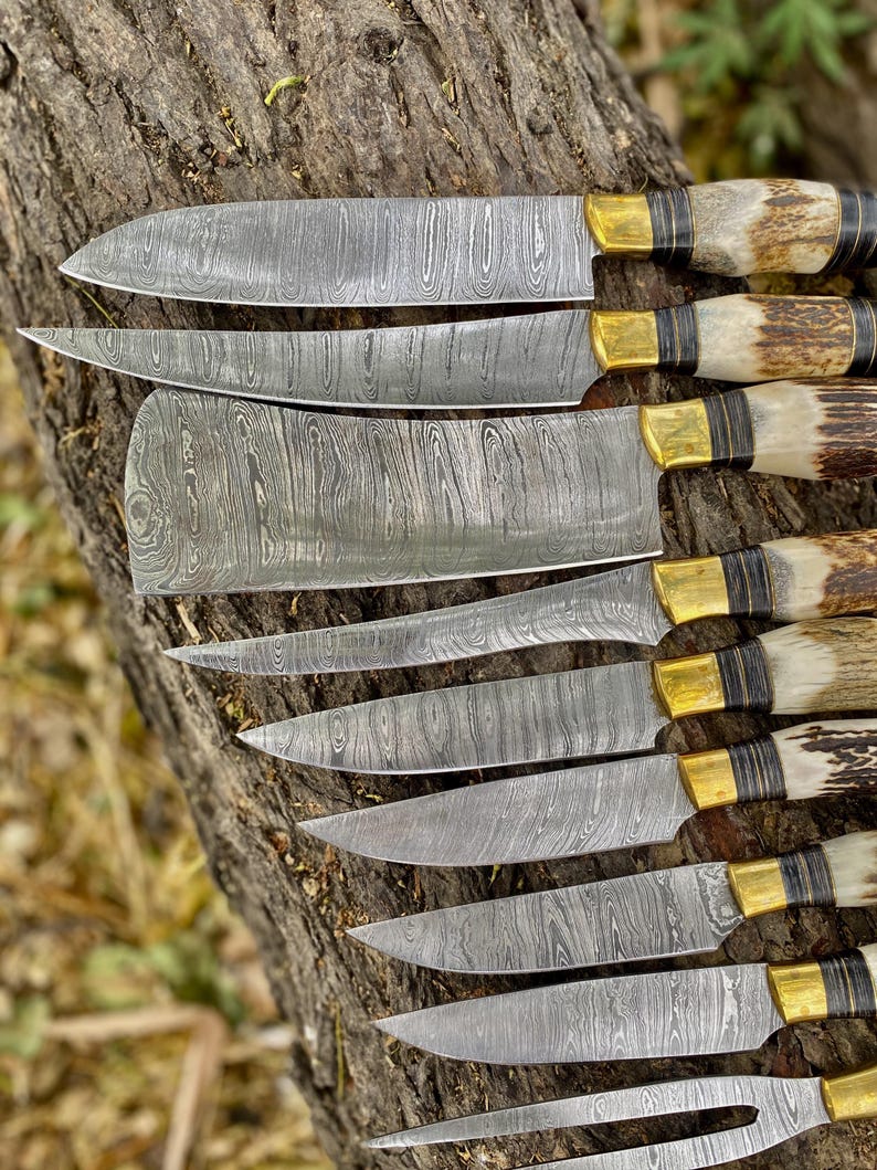 Custom Handmade Damascus Steel Chef Set With Leather Roll Kit Stag Handle