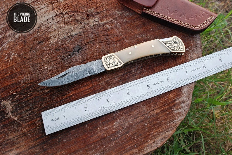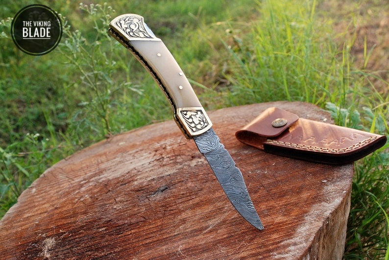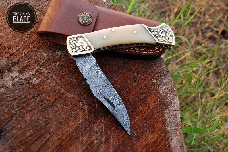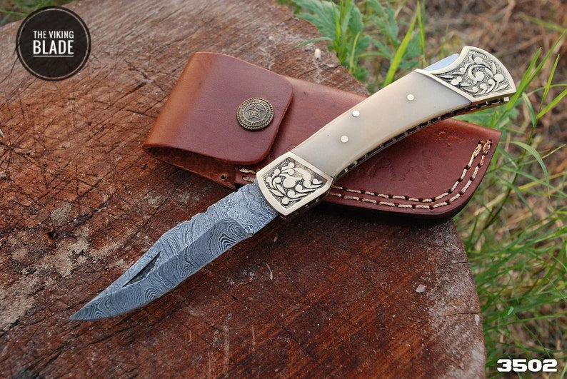Custom Handmade Damascus Steel folding pocket knife Hunting Camping Comes with Genuine Leather Sheath