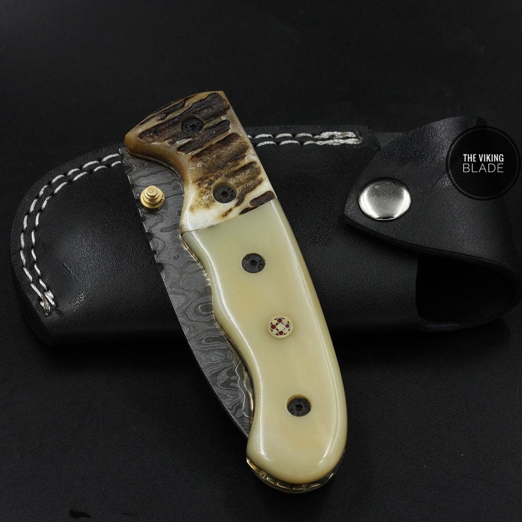 Custom Handmade Damascus Steel Folding Pocket Knife With Leather Pouch
