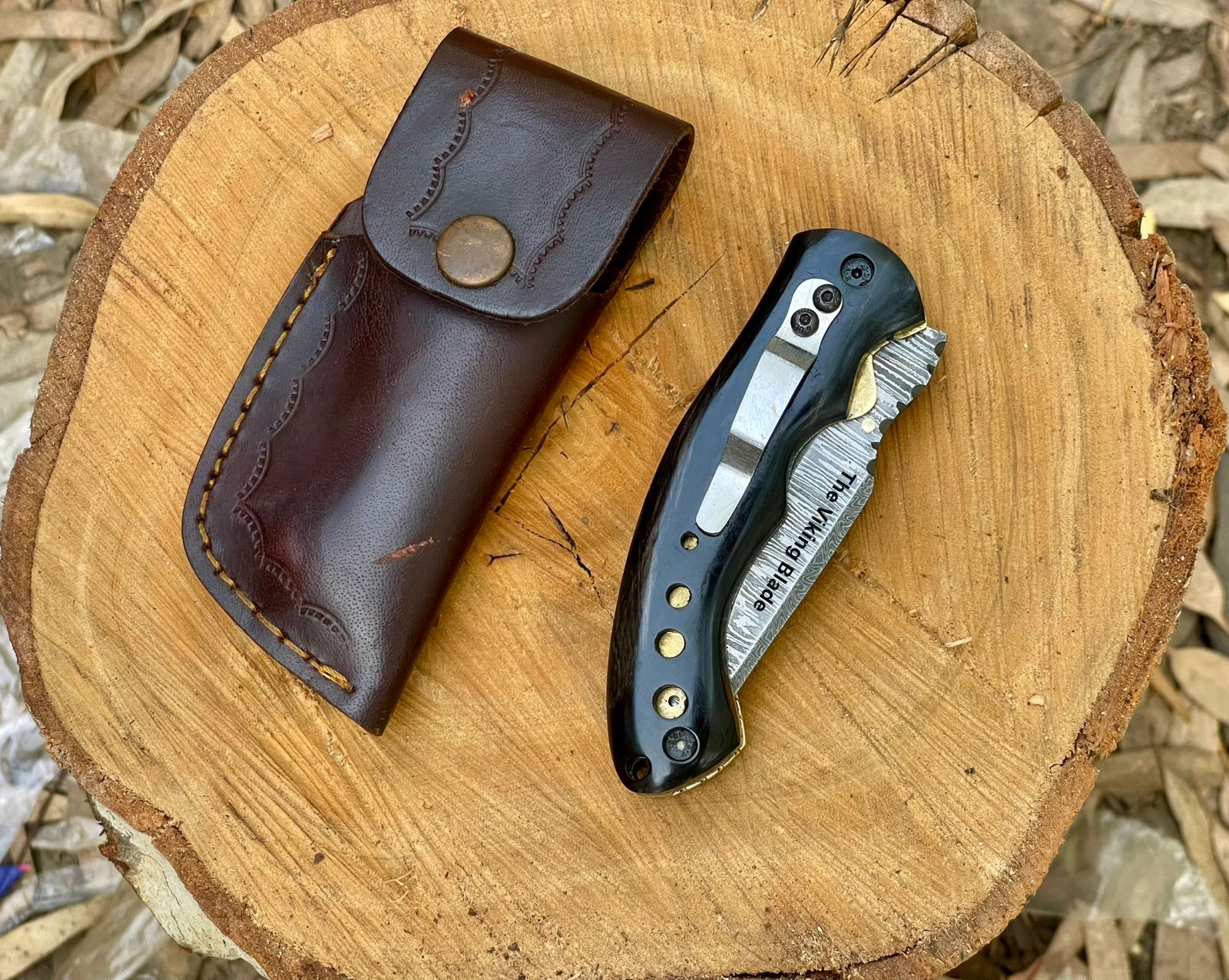 Custom Handmade Damascus Steel Folding Pocket Knife With Leather Pouch
