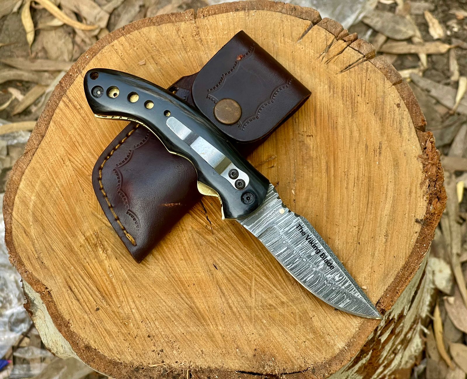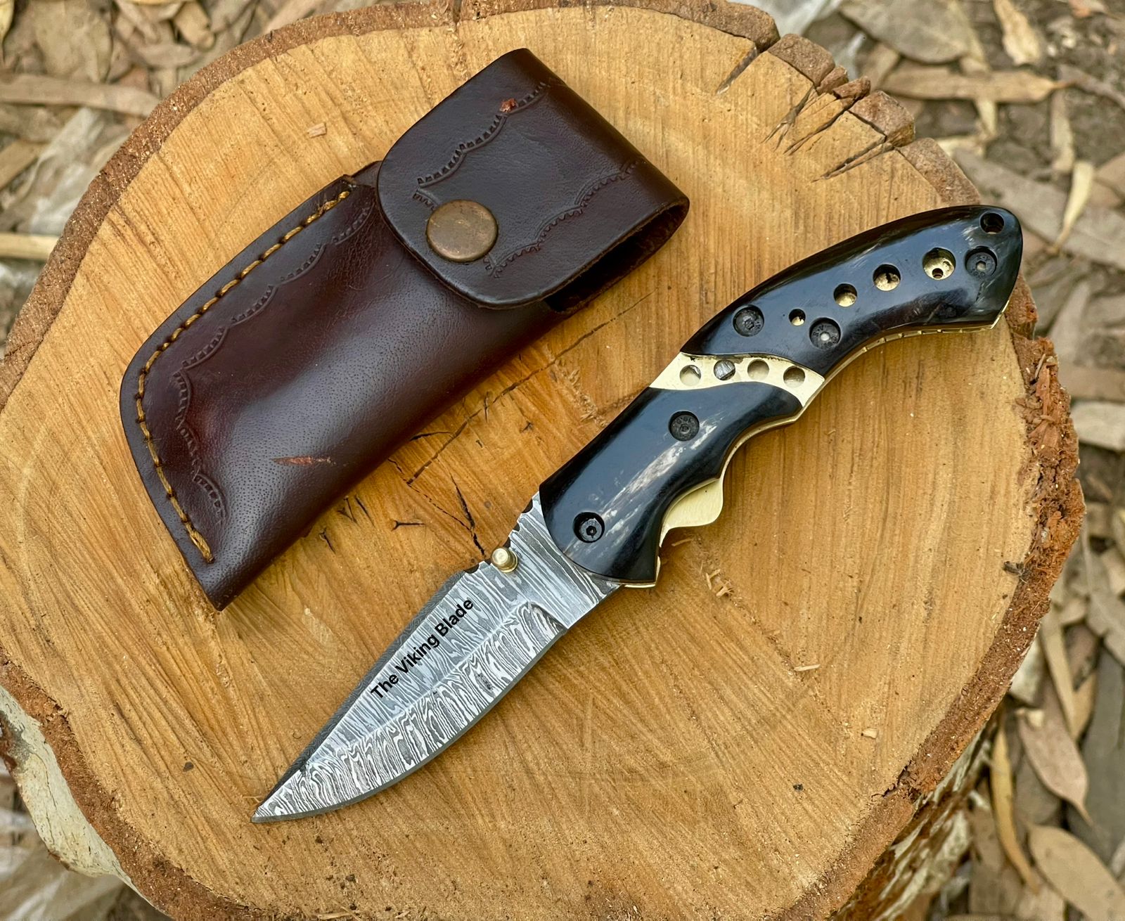 Material: Damascus, Bull Horn, Brass, Leather