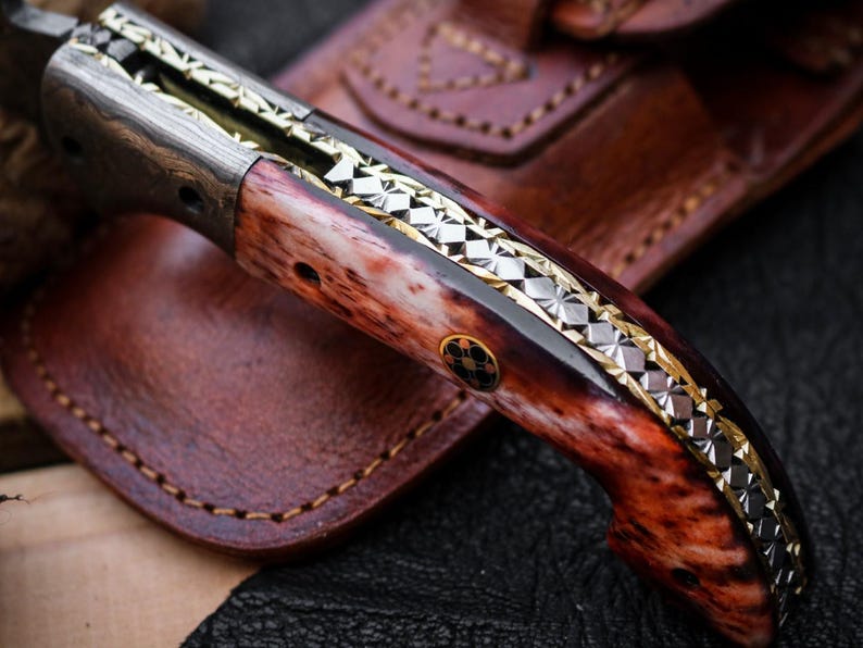HANDLE MATERIAL: Liner lock Bone in brown color with damascus bolsters