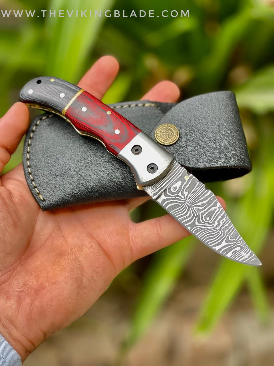 Custom Handmade Damascus Steel Folding Pocket Knife With Leather Pouch