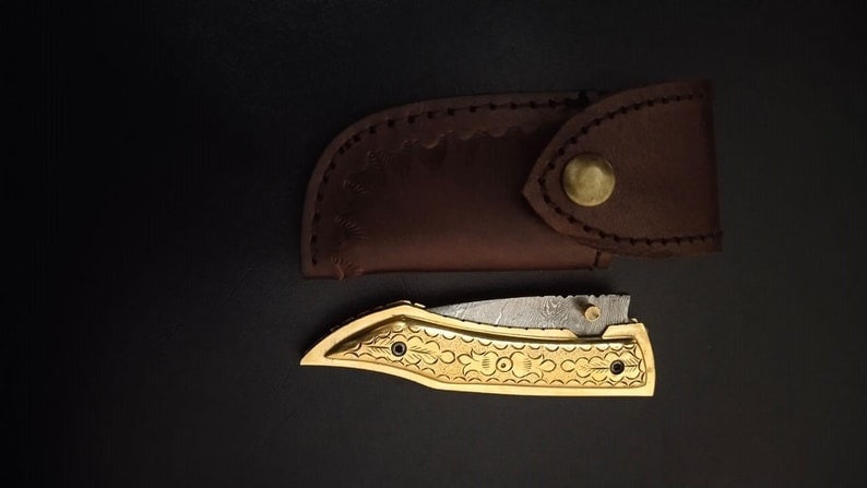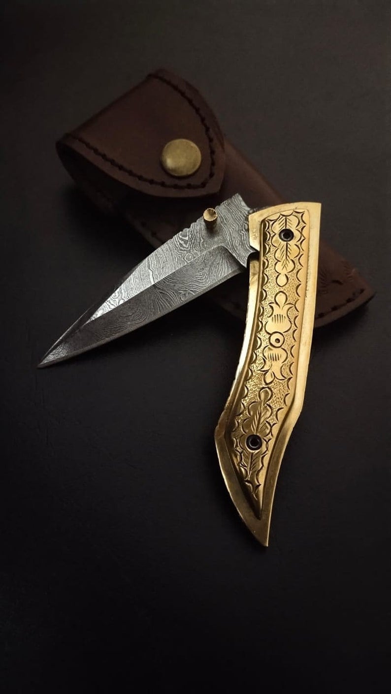 Custom Handmade Damascus Steel Folding Pocket Knife With Leather Sheath