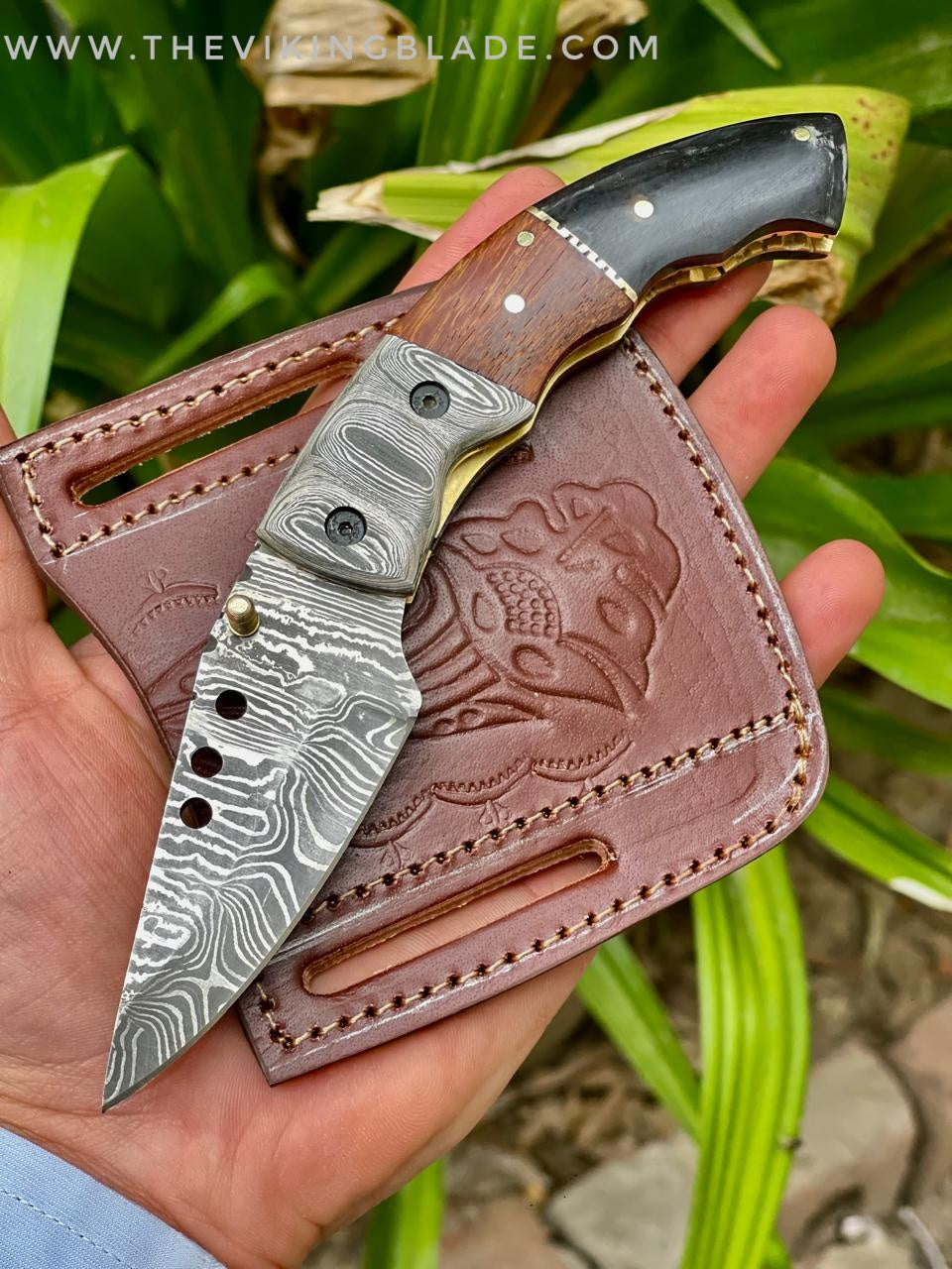 Custom Handmade Damascus Steel Folding Pocket Knife With Leather Sheath
