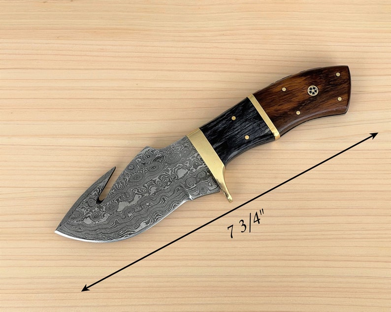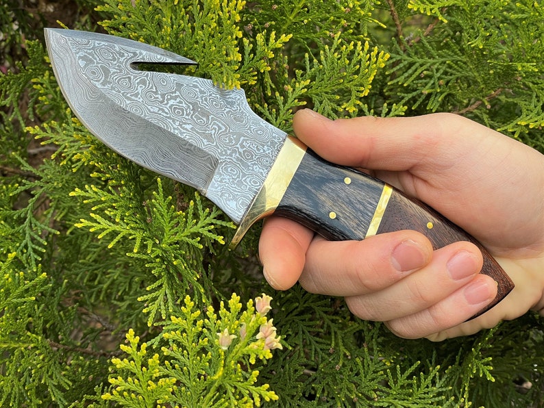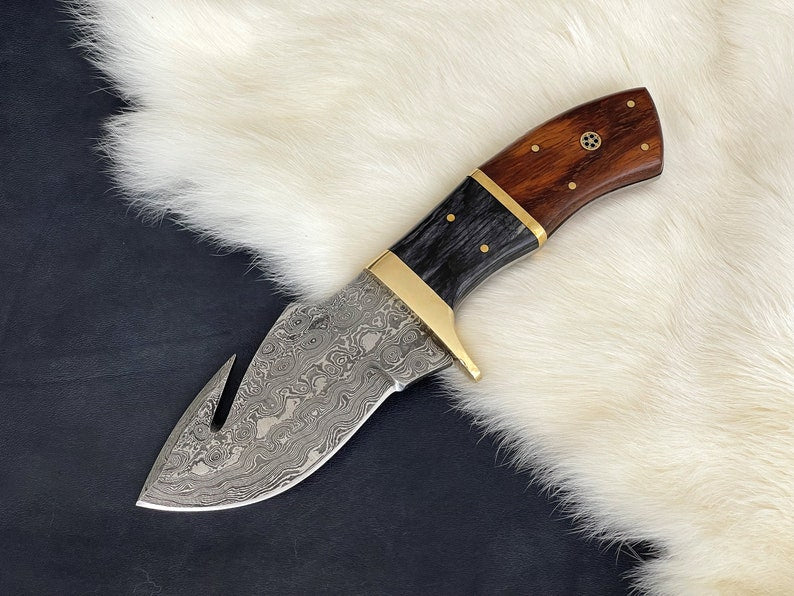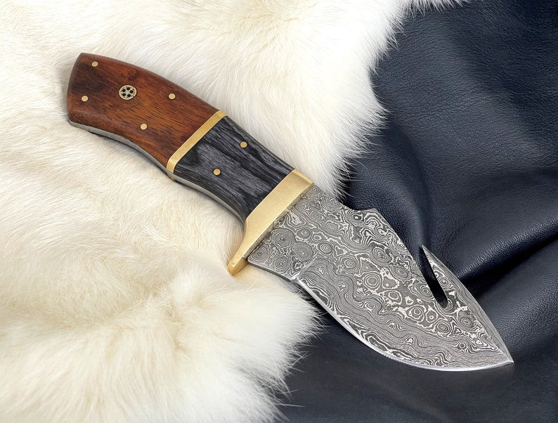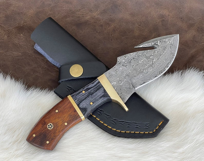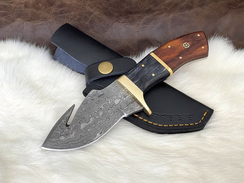 Custom Handmade Damascus Steel Gut Hook Hunting Knife With Leather Sheath
