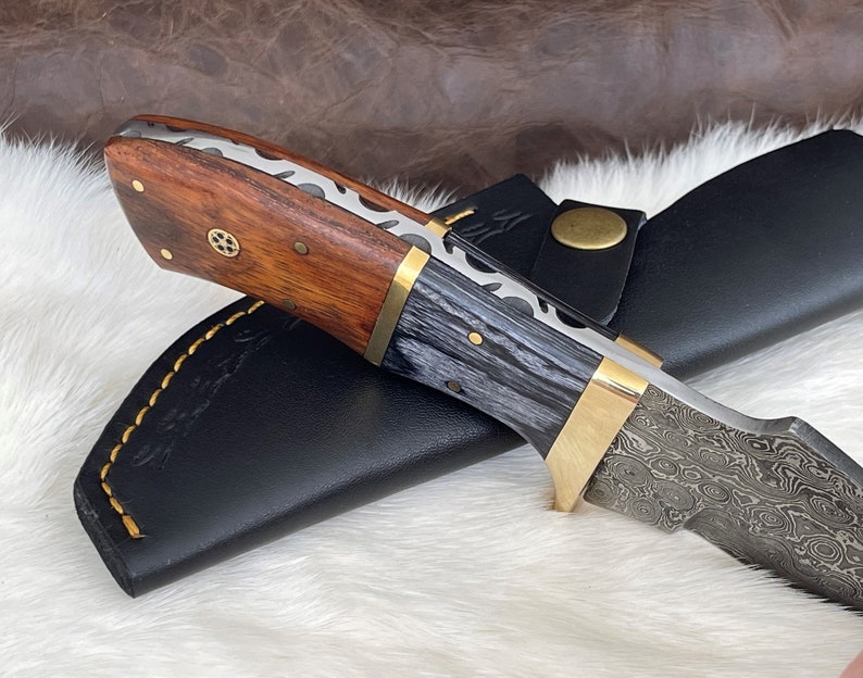 The blade of the knife is made of authentic Damascus steel. The handle of the knife is made of rosewood and black wood.