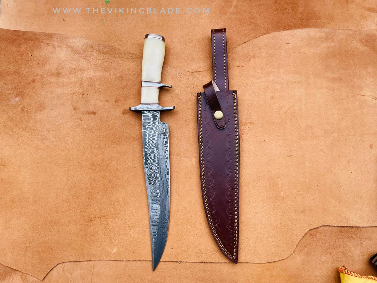 Custom Handmade Damascus Steel Hunting Bowie Knife With Leather Sheath