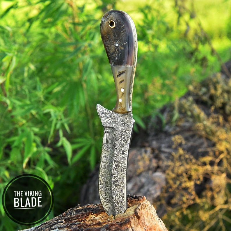 Custom Handmade Damascus Steel hunting fixed blade survival bull Cutter knife Ram Horn Comes With Genuine Leather Sheath