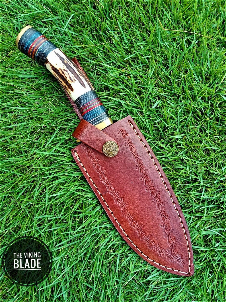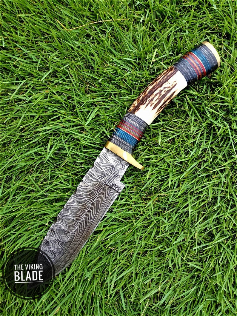 Custom Handmade Damascus Steel Hunting Skinning Knife Deer Stag Handle Survival Comes with Genuine Leather Sheath
