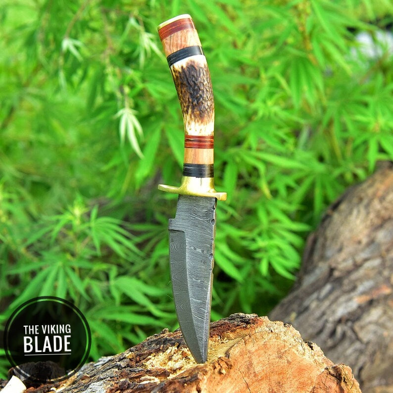 Custom Handmade Damascus Steel Hunting Skinning Knife Stag HANDLE BRASS GUARD Comes With Genuine Leather Seath