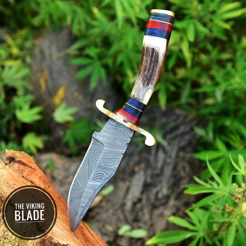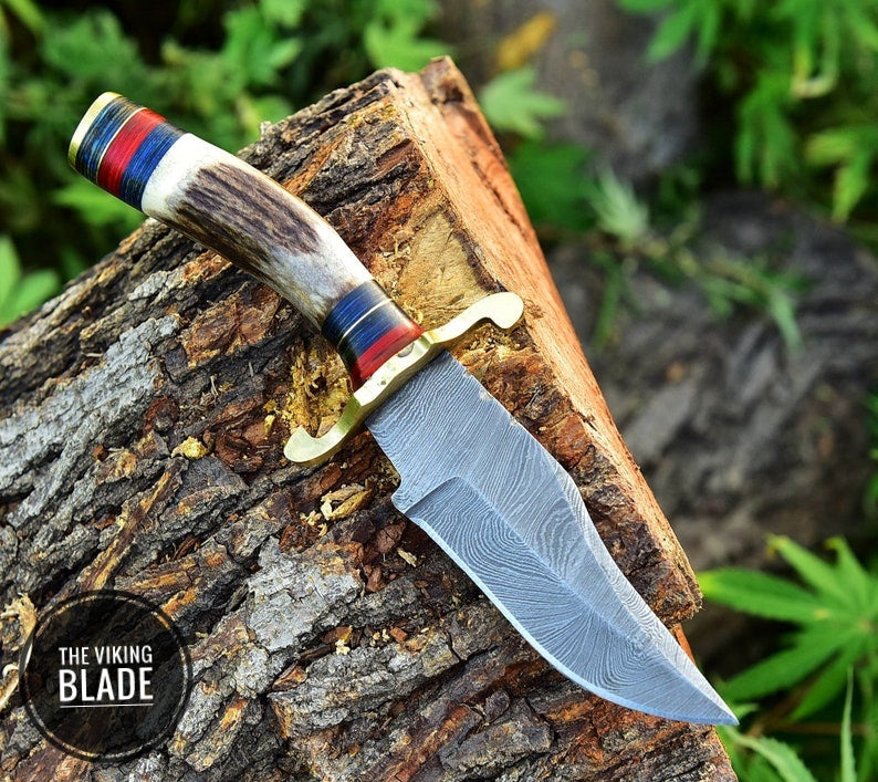 CUSTOM Handmade Damascus Steel HUNTING SKINNING Knife Stag Handle Brass Guard Comes With Genuine Leather Sheath