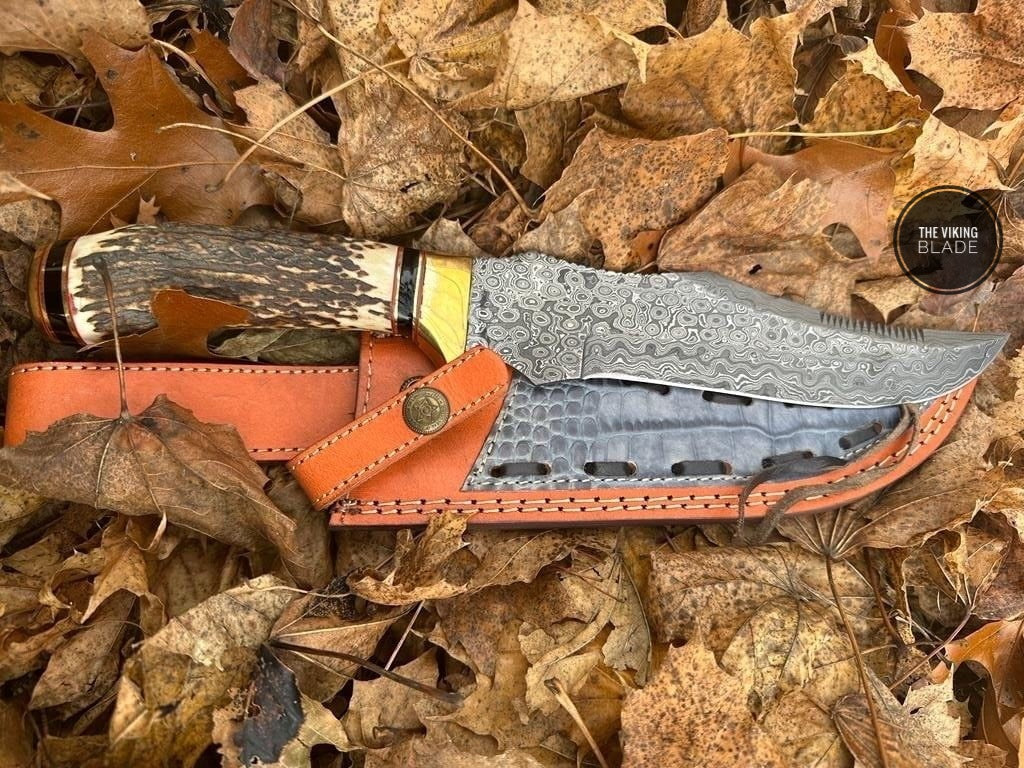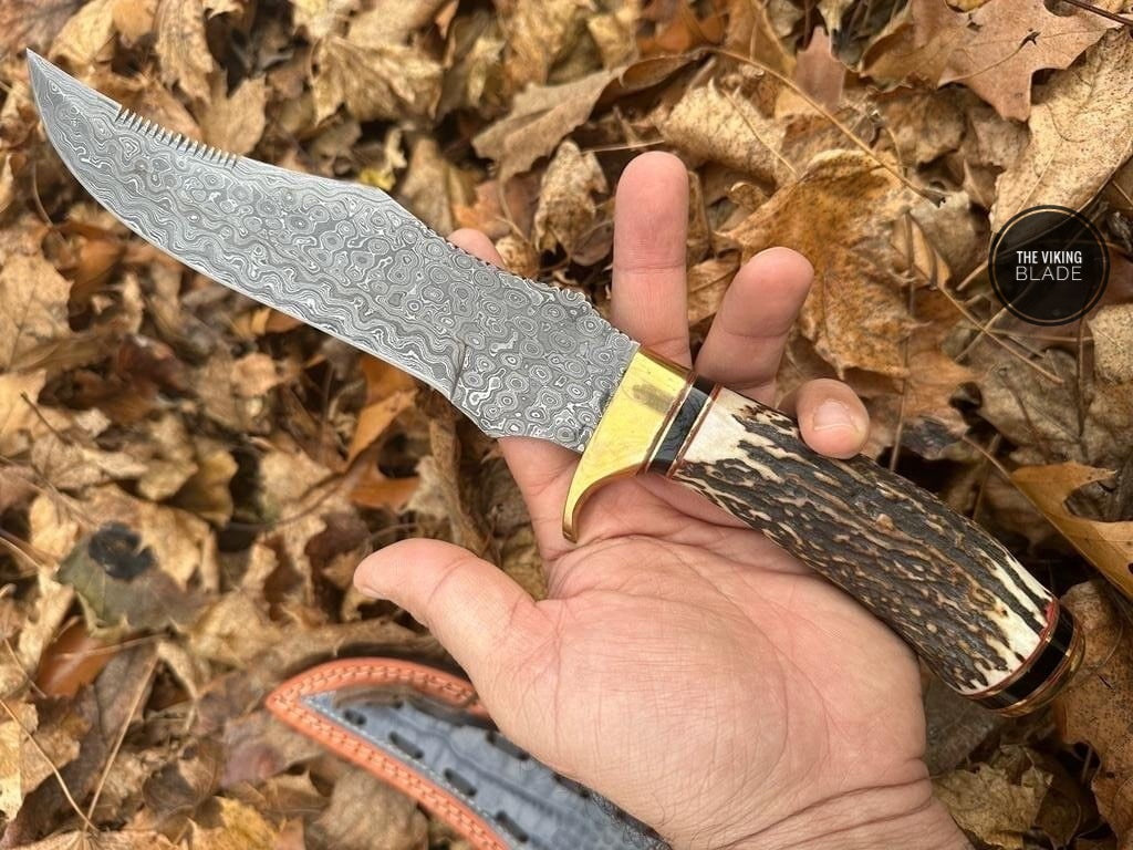 Custom Handmade Damascus Steel Knife with Stag Antler Handle – Premium 13 inches, Brass Hilt, Rain Drop Pattern – Ideal for Hunting, Camping, Outdoor Adventures