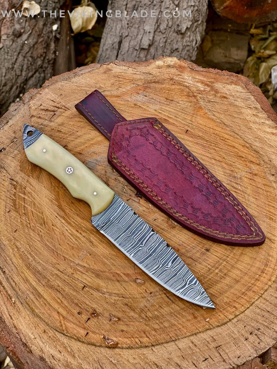 Custom Handmade Damascus Steel Skinner Hunting Knife With Leather Sheath