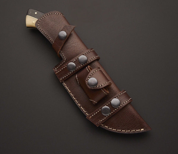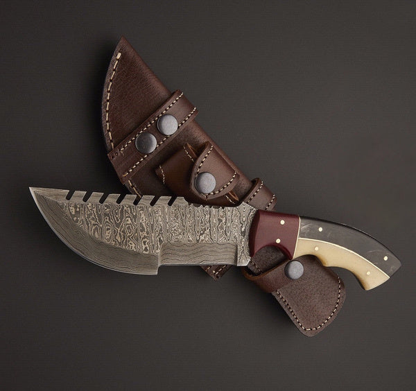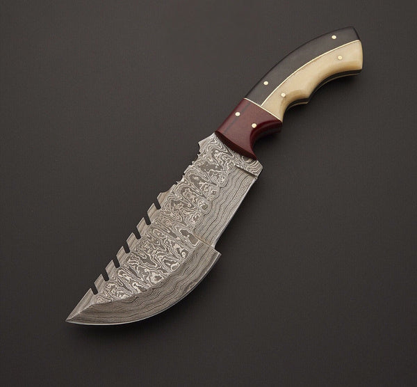 Custom Handmade Damascus Steel Tracker Knife Black Horn, White Bone, Red Micarta Sheet, Handled With Leather Sheath