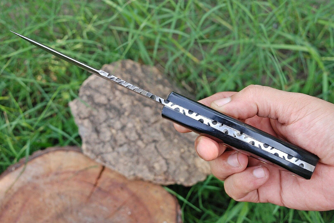 Blade of this knife has a nice file work and is made of 512 layers of stainless steel and high carbon steel with hardness 55-60 HRC . This robust knife is lab tested under intense conditions,; the balance and shape of this knife ensures perfect grip.