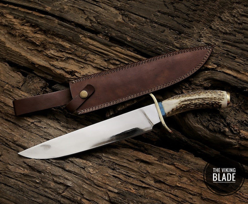 Custom Handmade Stainless Steel Bowie Knife With Stag Handle With Leather Sheath