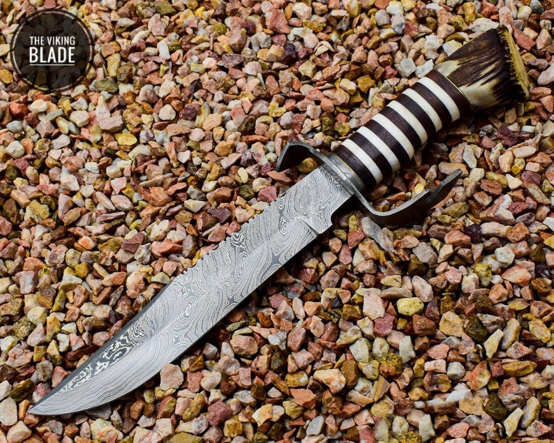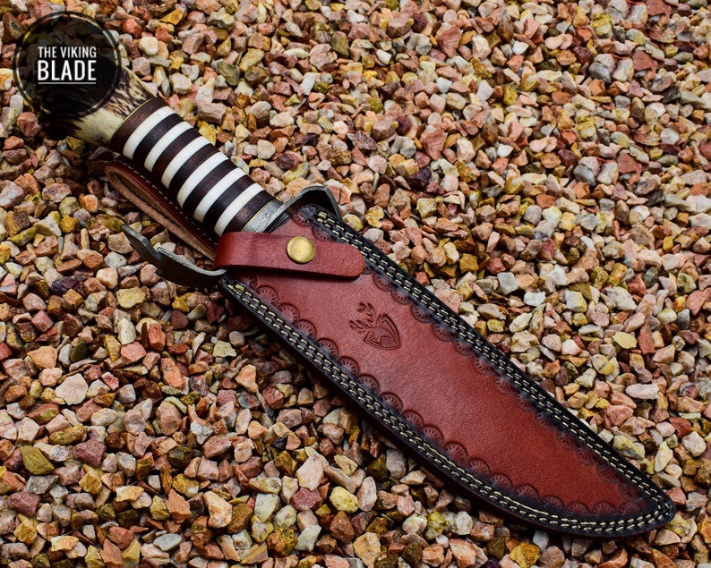 Custom Made Damascus Steel Bowie with Stag Antlers Crown Handle With Genuine Leather Sheath