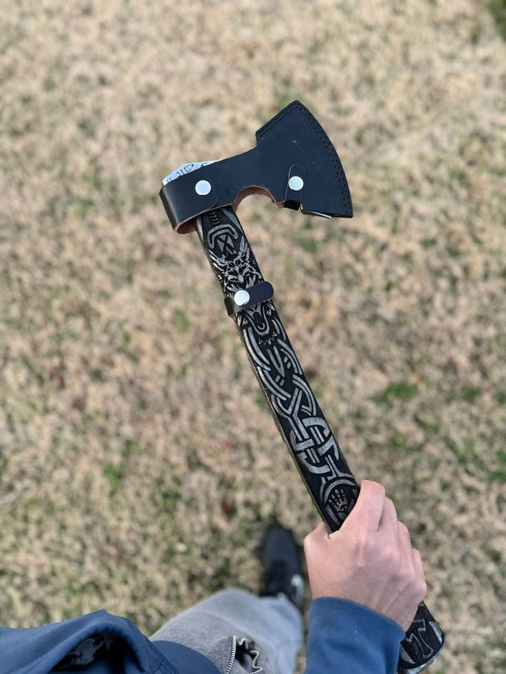 Carefully Engraved and Etched to give high spirits to its user. Axe is sharp and fully functional. Comes with Leather Sheath