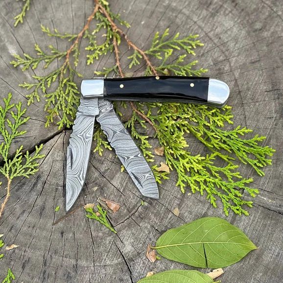 This knife features two blades, both made from high-quality Damascus steel, a strong and durable material known for its sharpness and strength. The handle is made from buffalo horn and steel bolsters, providing a comfortable grip while using the knife. The blade length of each blade is 3.2 inches, making it a perfect size for a folding pocket knife that can be carried around easily. The knife comes with a leather case for safekeeping and easy transportation.