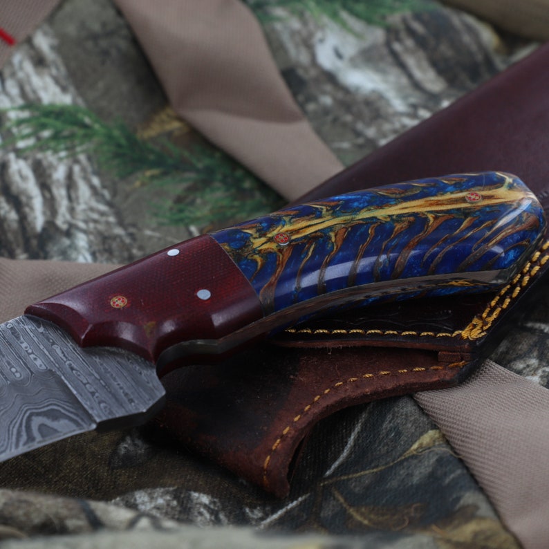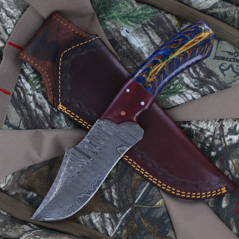 Damascus Hunting Knife | Full Tang Functional Camping Hiking Fishing S Curve Blade w/ Contoured Unique Blue Handle