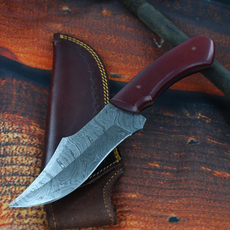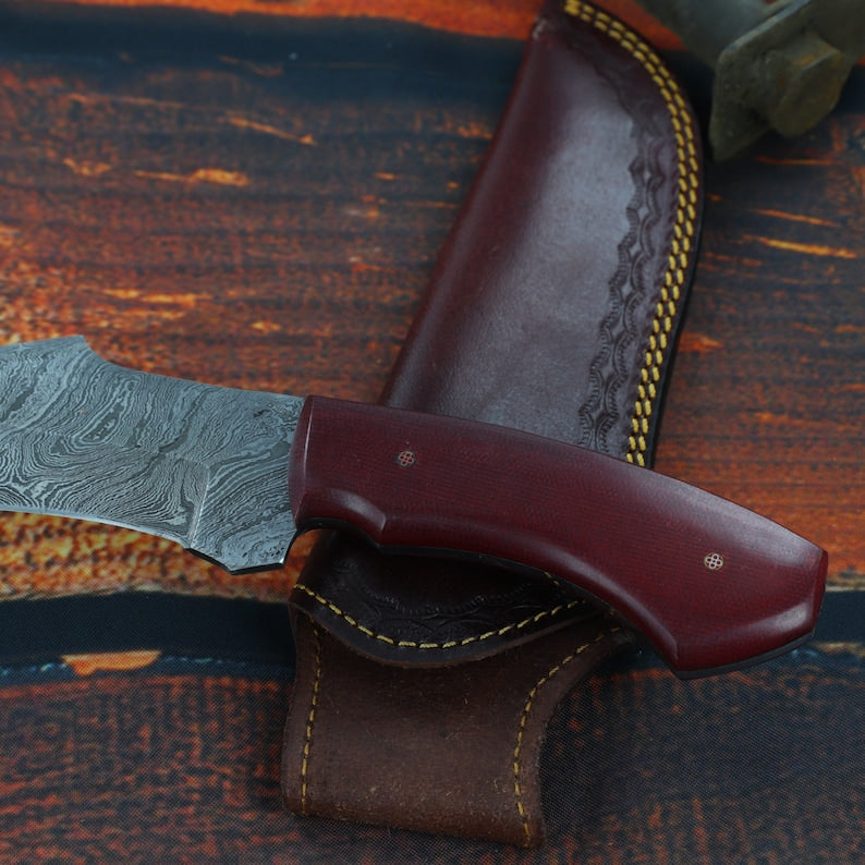 Damascus Hunting Knife | Full Tang Functional Hiking Camping Fishing S Curve Blade w/ Contoured Red Handle