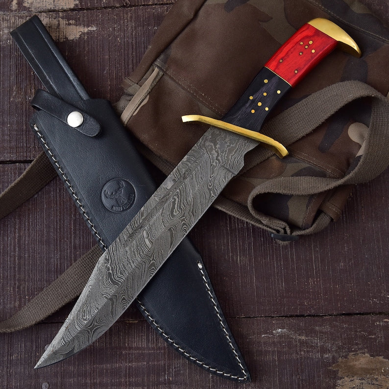 Damascus Steel Hunting Knife - Pattern Welded Clip Point Collectible Outdoor Knife with Leather Sheath