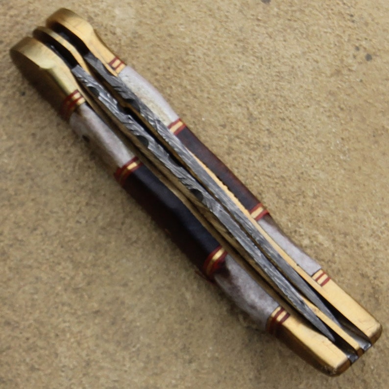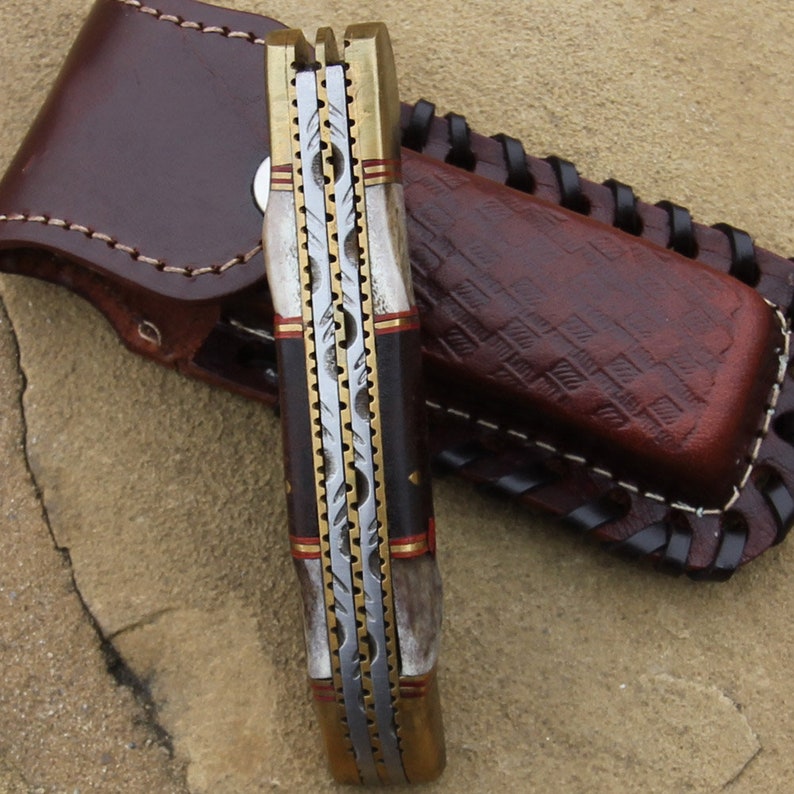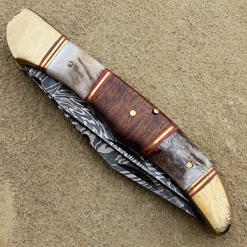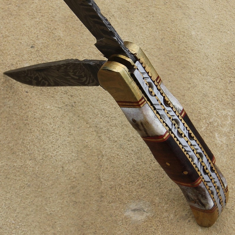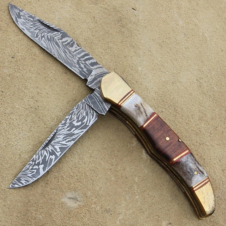 Double Blade Guild Stag Damascus Steel Pocket Knife - Collectible Folding Pocket Knife | Wood & Stag Handle