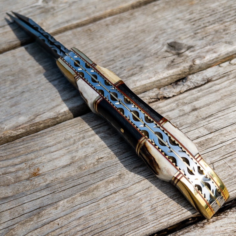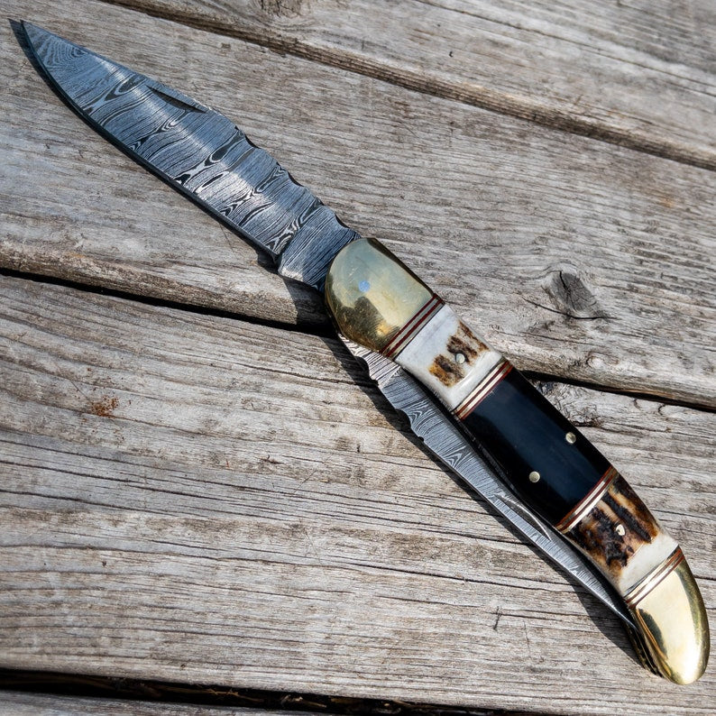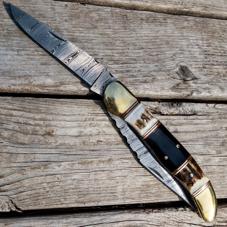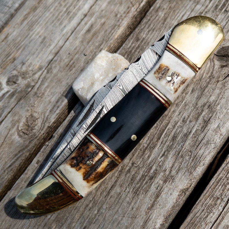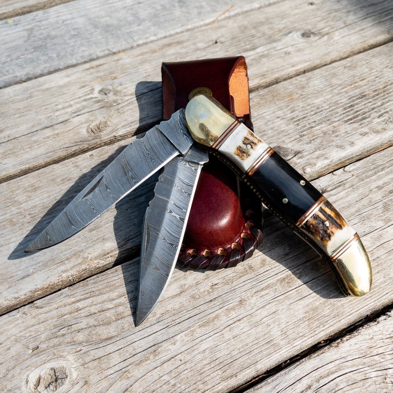 Double Blade Guild Staghorn Damascus Steel Pocket Knife - EDC Pattern Welded Steel Folding Knife | Deer Stag Antler & Buffalo Horn Handle
