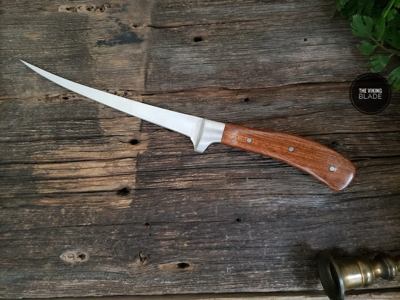 The handmade, exotic wood handle crafted on a 12 inch, full tang, fish fillet knife makes it both beautiful and functional.