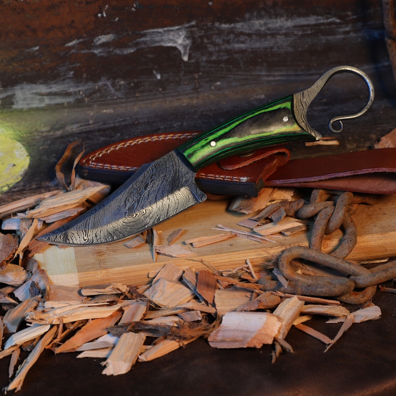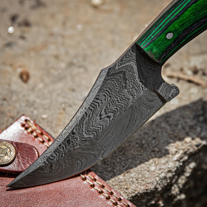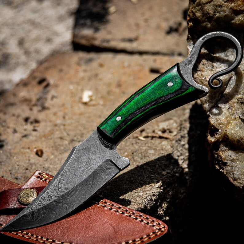 Functional Full Tang Damascus Sharpened Trailing Point Blade w/ Finger Hole - Green Handle