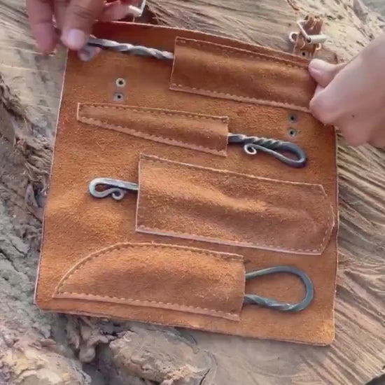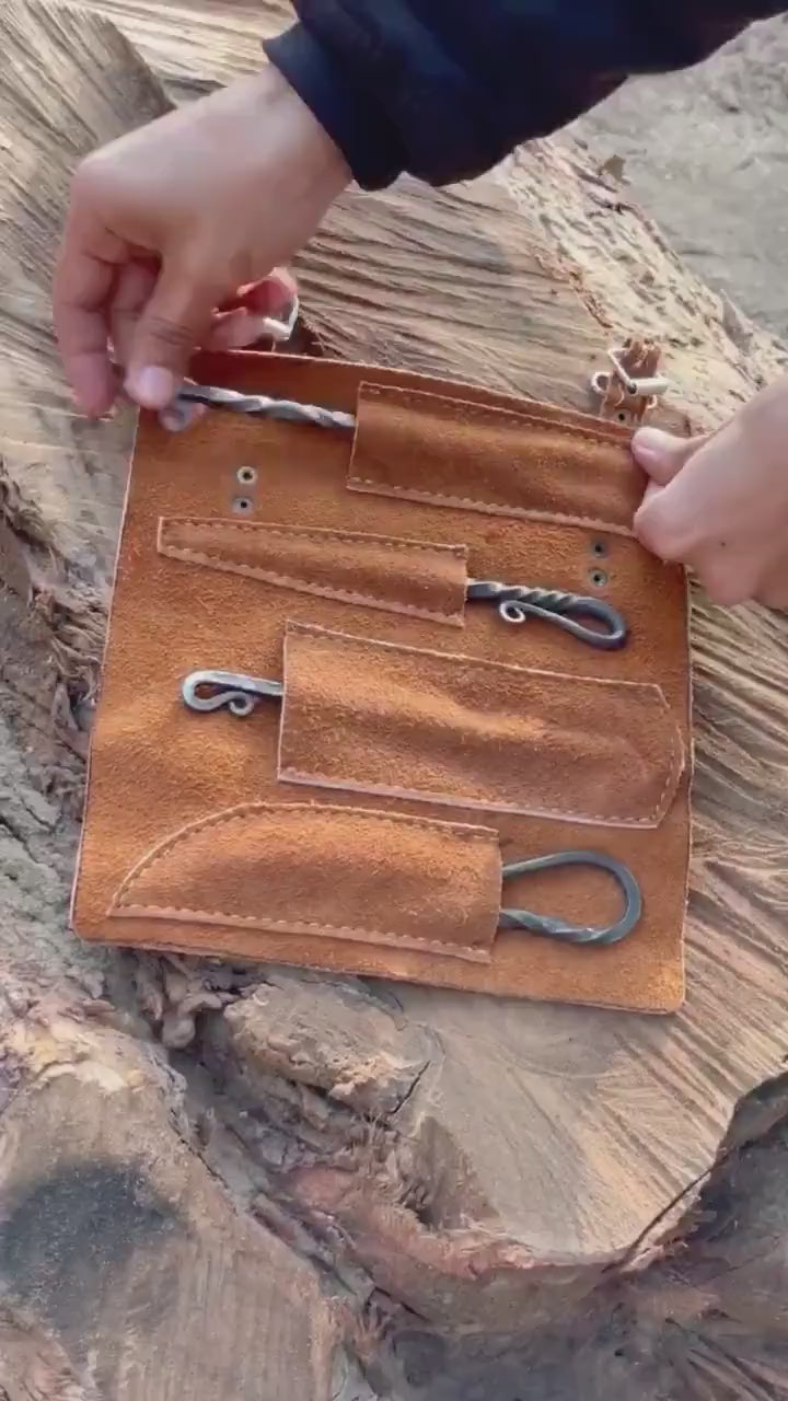 Hand-Forged Medieval Utensil Set, Carbon Steel Fork, Spoon, Knife & Pick with Leather Roll cover