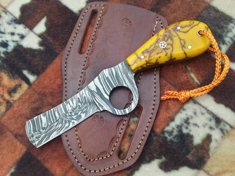 Handmade Cowboy Knife 8" Damascus Fixed Blade Bull Cutter Pancake Leather Sheath