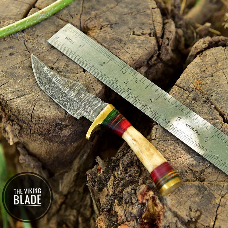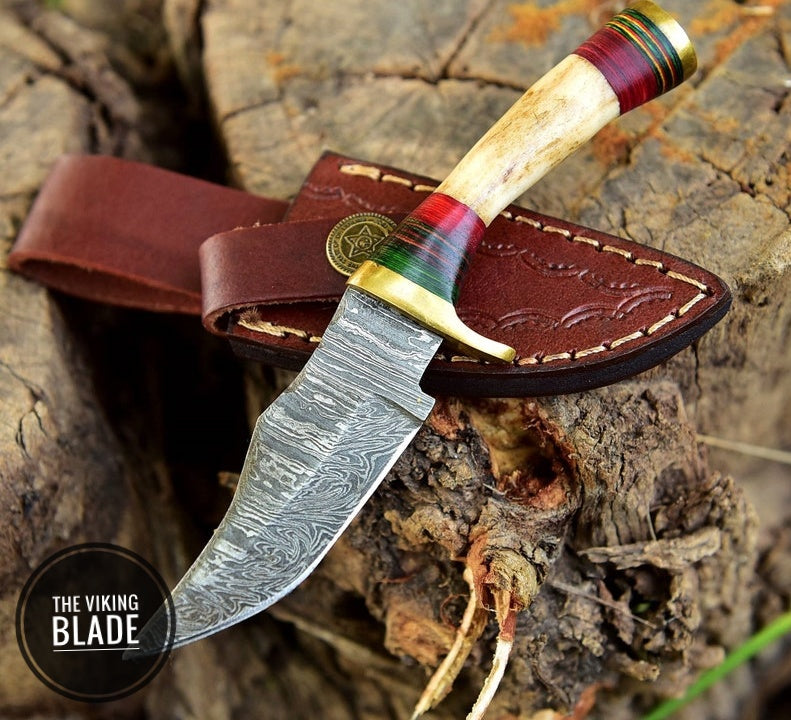 Handmade Damascus Skinning Hunting Fix Blade Knife Stag Antler & Brass Guard Comes With Genuine Leather Sheath