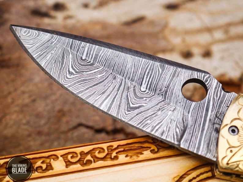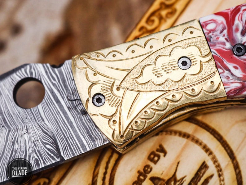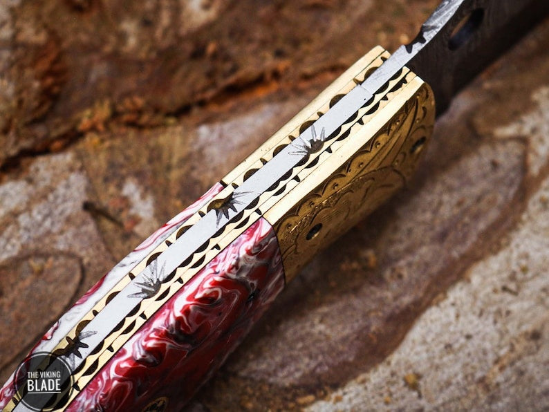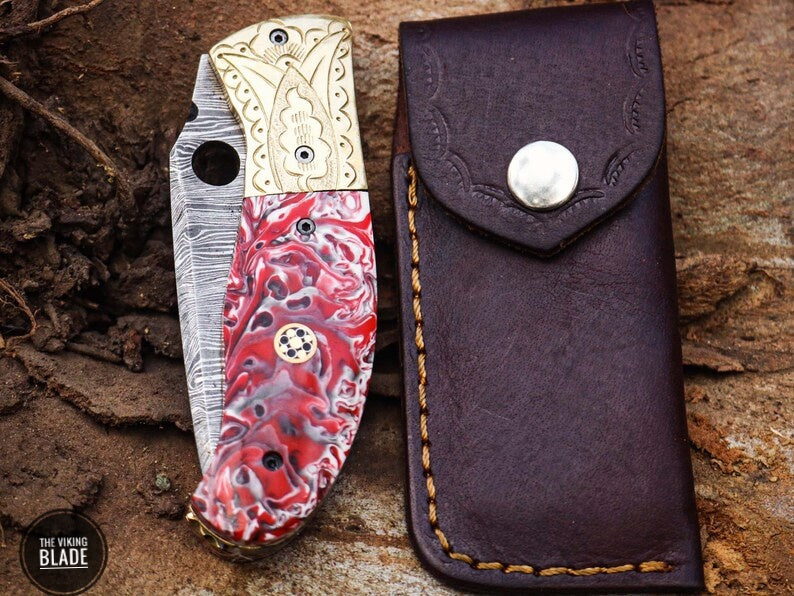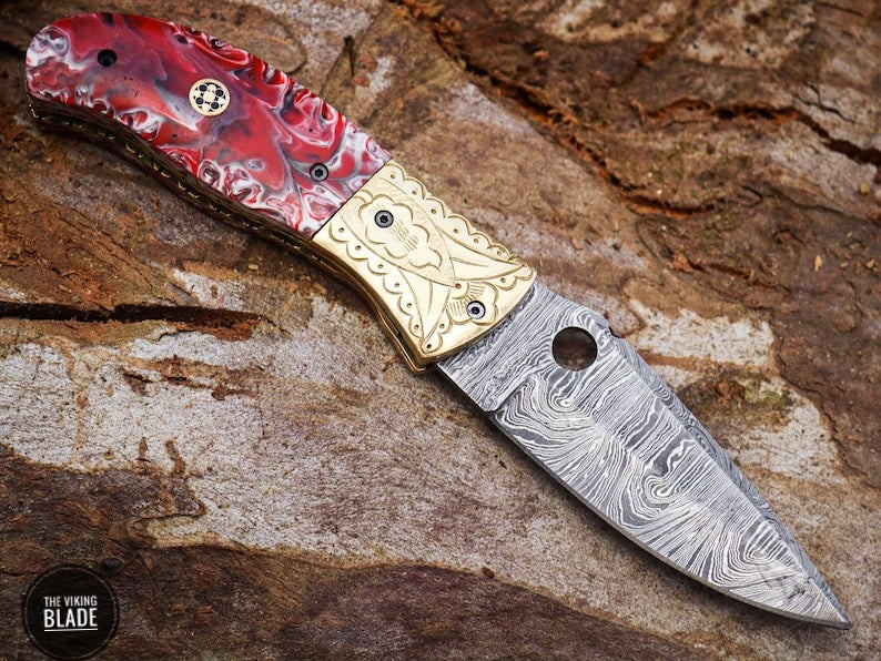 Handmade Damascus Steel Pocket Knife, Hand Forged Damascus Knife, Resin and Brass Handle