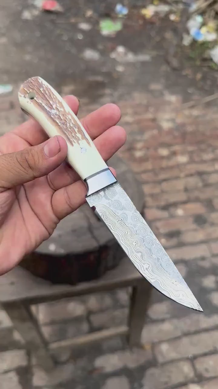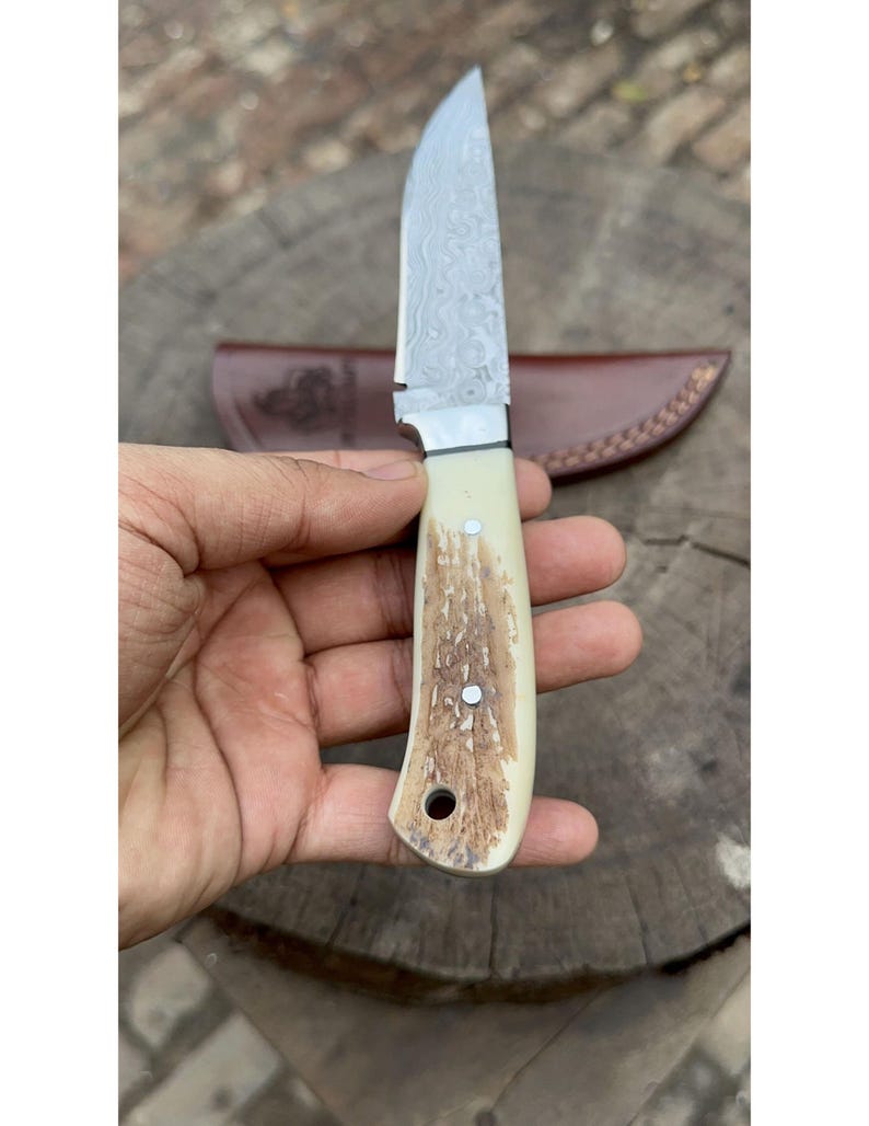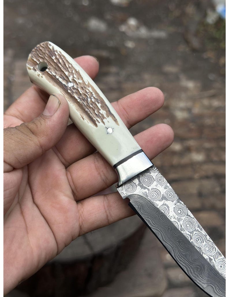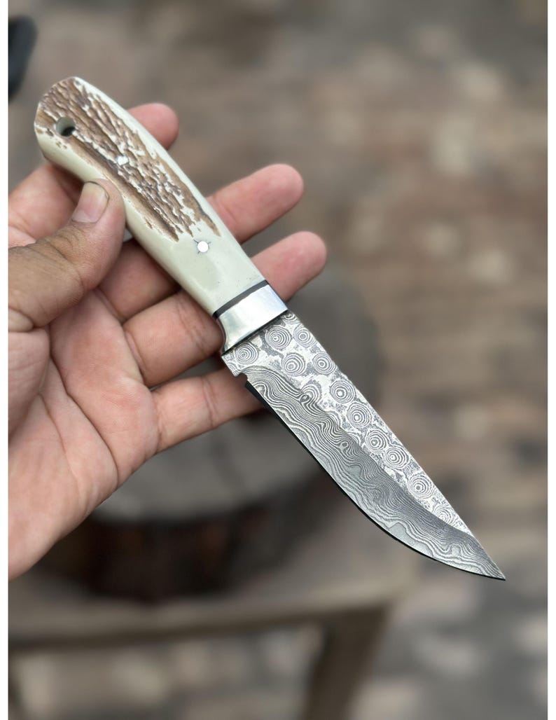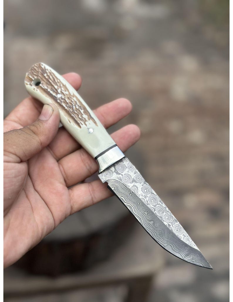 Custom Handmade Damascus Steel Knife | Stag Antler Handle | Hunting, Camping, Collectible Knife