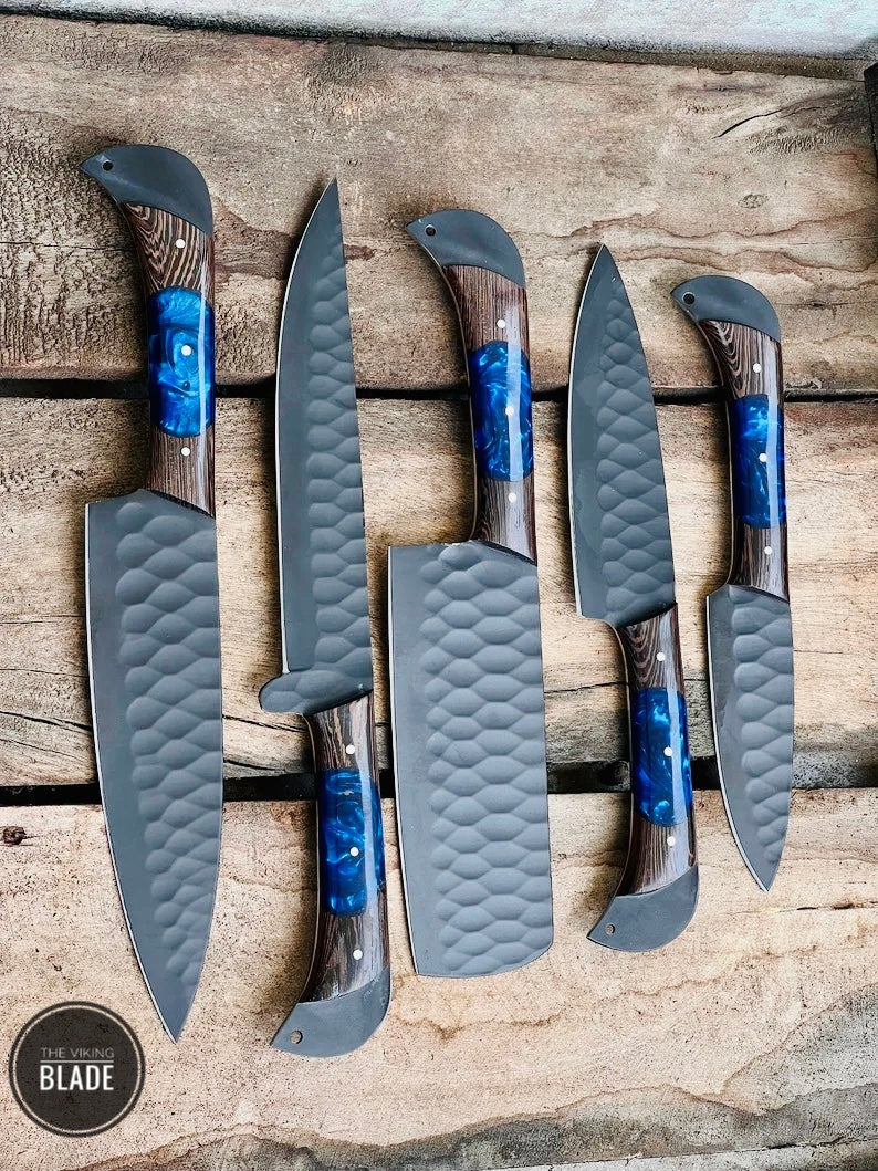 Set of 5 Custom Handmade Stainless Steel Chef Knives, Powder coated Blades, Wenge Wood & Resin blades Set of 5 Custom Handmade Stainless Steel Chef Knives, Powder coated Blades, Wenge Wood & Resin blades